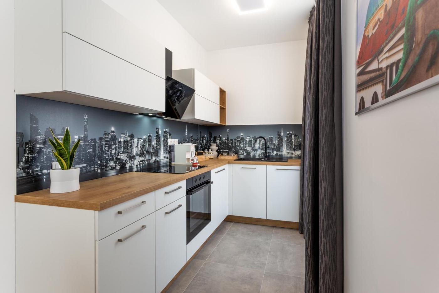 Deluxe One-Bedroom Apartment. Featuring a private entrance, this air-conditioned apartment is comprised of 1 living room, 1 separate bedroom and 1 bathroom with a shower. In the kitchen, guests will find a stovetop, a refrigerator, a dishwasher and kitchenware. The apartment offers a washing machine, soundproof walls, a tea and coffee maker, a flat-screen TV with streaming services, as well as city views. The unit offers 2 beds. ;